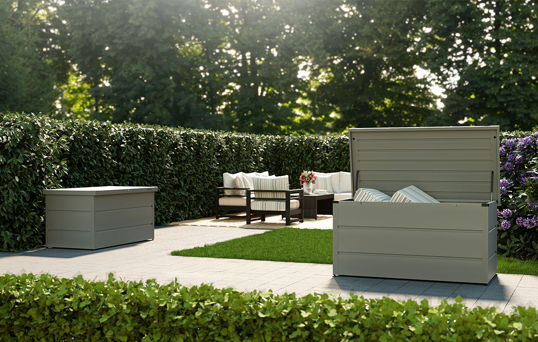 Die Juno-Gartenbox von Hörmann hat als praktische Stauraumlösung viel Platz für Kissen, Garten- und Terrassenutensilien oder Spielsachen. So ist alles bestens geschützt und der aufgeräumte Balkon oder Garten wird optisch deutlich aufgewertet.
